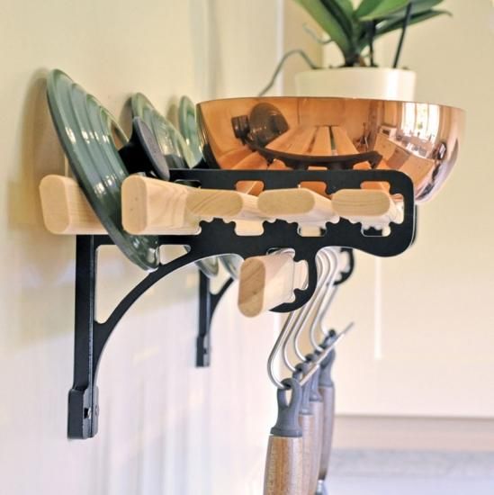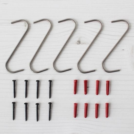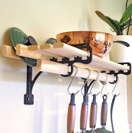鋳鉄製ブラケットと天然木のバーを組み合わせたKITCHEN SHELF RACK。壁に取り付けたブラケットの間に8本のバーを通すだけで壁面ラックが完成します。バーは縦、横どちらにも差し込むことができ、乗せるものや引っ掛けるものに合わせて自在にカスタマイズが可能。また、棚部分の一段下にもバーが一本通せるようになっており、付属のS字フックを使ってミルクパンやジャグ、タオルやキッチンツールなどを吊り下げて収納できます。もちろんキッチン以外にもリビング、エントランスなどの収納棚としてもぴったり。重厚なキャストアイアンと天然木を組み合わせたクラシカルな雰囲気は、時間の経過と共にエイジングも楽しめます。高い収納力とデザイン性を兼ね備えたシェルフラックです。