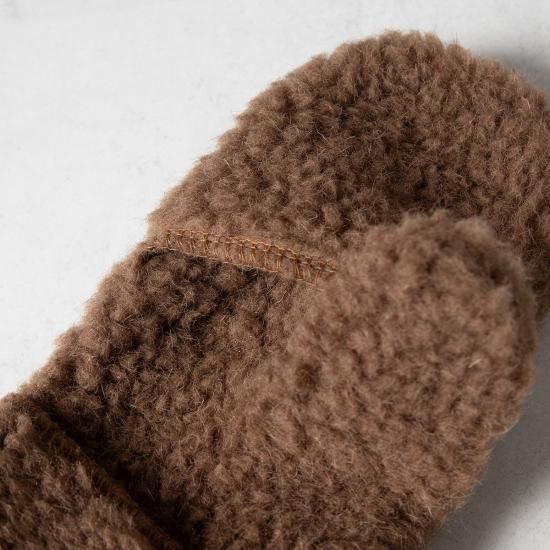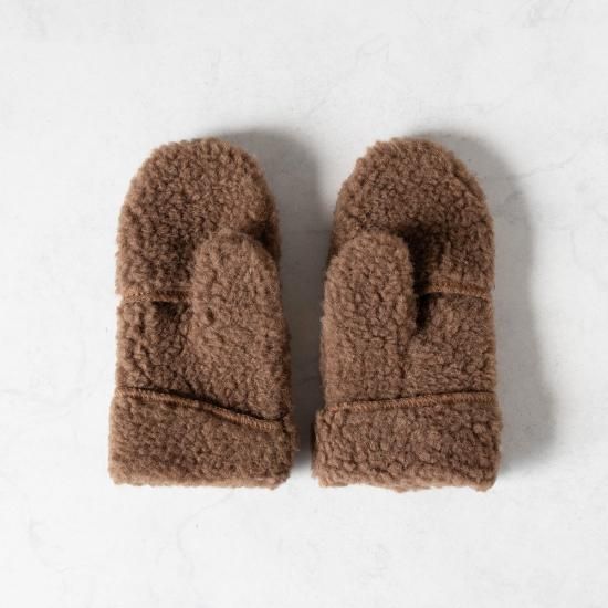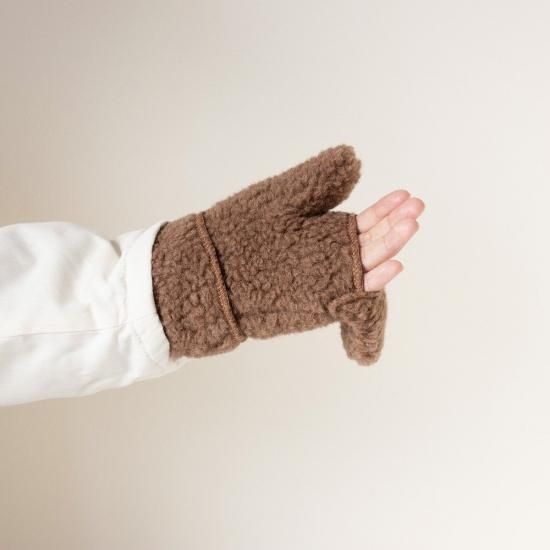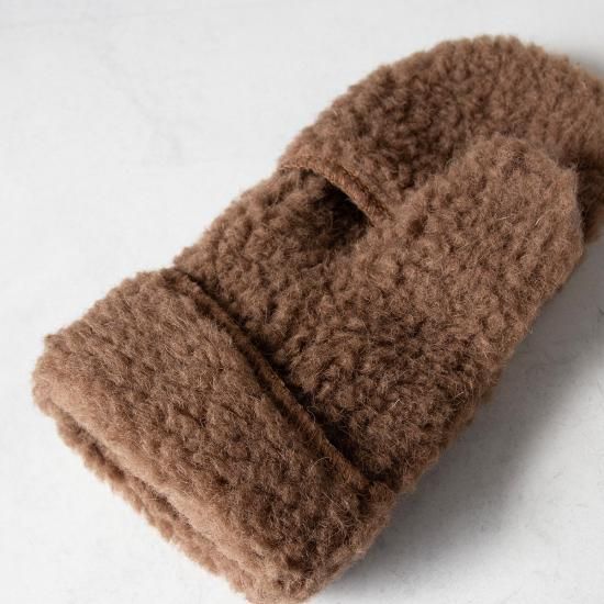 ウール100%のフードミトン。指先から手首までをしっかりカバーしてくれるのでとても暖か。ミトンとフィンガーレスの2WAYタイプで、ちょっとした作業時も便利です。ボリューム感のあるふわふわとした見た目も可愛らしく、寒い冬には手放せないアイテム。ギフトにもおすすめです。
