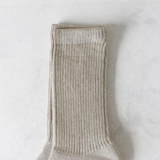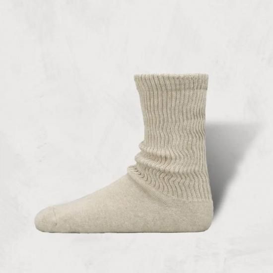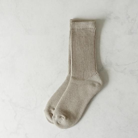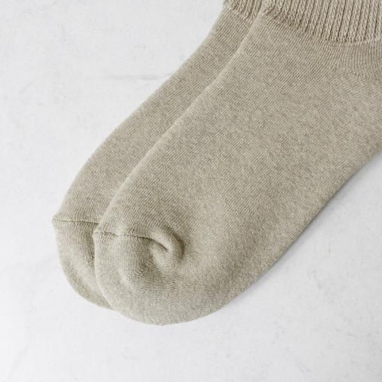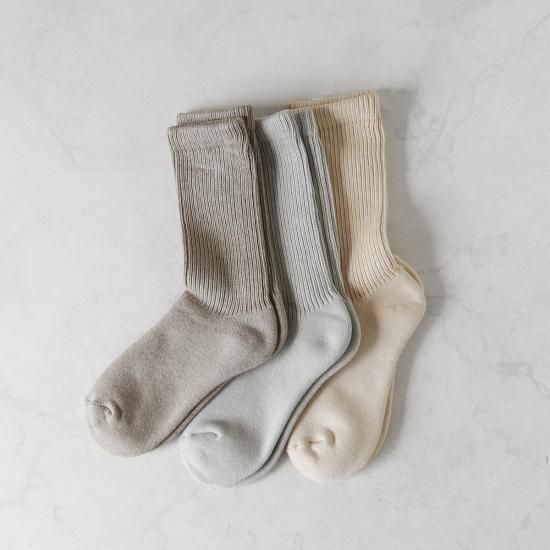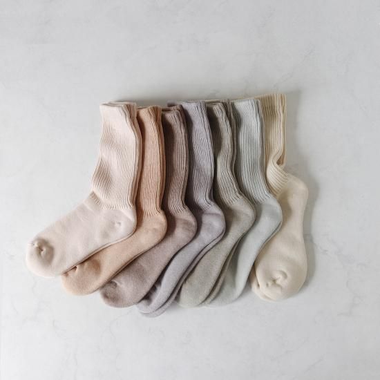 廃棄予定だった食材から抽出される成分で染色したオーガニックコットンの糸を使って編み上げた「Organic Pile Socks」。こちらはスウェルチア(センブリ)染めの糸で仕立てています。足部の内側はパイル状になっており、クッション性、吸水性も抜群。天然染めならではの自然な色合いとオーガニックコットンの優しい肌触りがなんとも魅力的な一足です。