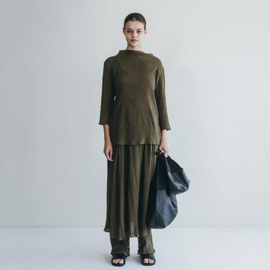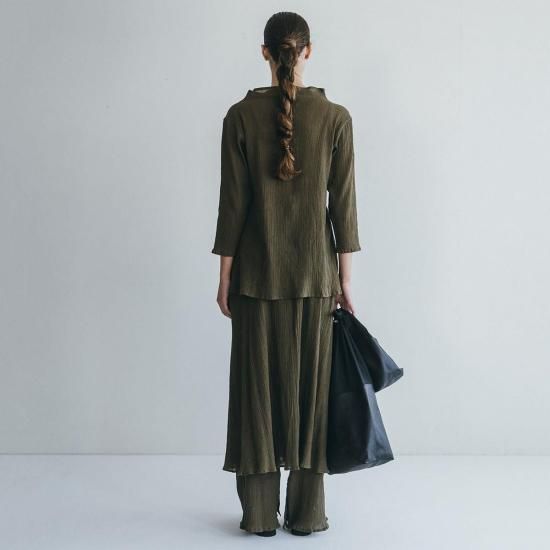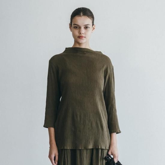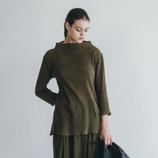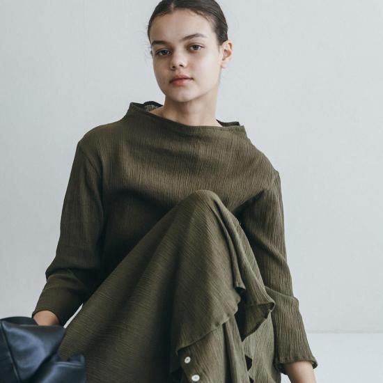 伸縮性のあるコットン素材で仕立てた「バルカル シャツ」。ストレッチの効いた生地はリラックスしたフィットを味わえます。シワ加工が施された独特の表情、ゆとりを持たせたボトルネック、着丈と袖丈のバランス感もポイントに。ジャケットやコートとのコーディネート、共地のボトムスとのセットアップもおすすめの一着です。