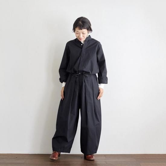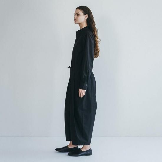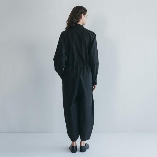 ハリのあるコットン素材で仕立てた「サティシュ ジャンプスーツ」。バンドカラー、比翼仕立て、袖口のカフス、ウエストのタックなど、各所に散りばめられた伝統的なディテールが印象的です。ウエストにはドローコードがあしらわれシルエットのアレンジも。八分ほどの長すぎない丈感で、スニーカーやレザーシューズはもちろん、ブーツとのスタイリングもおすすめの一着です。