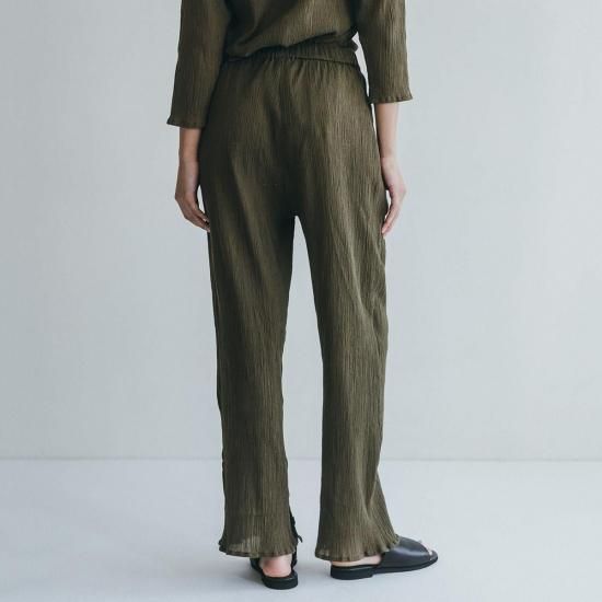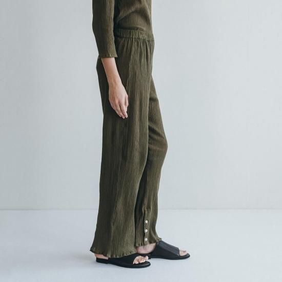 伸縮性のあるコットン素材で仕立てた「ヴィクラント パンツ」。ストレッチの効いた生地はリラックスしたフィットを味わえます。シワ加工が施された独特の表情、ややフレアの美しいシルエット、裾にあしらわれたボタンもポイントに。ジャケットやワンピースとのコーディネート、共地のトップスとのセットアップもおすすめの一本です。