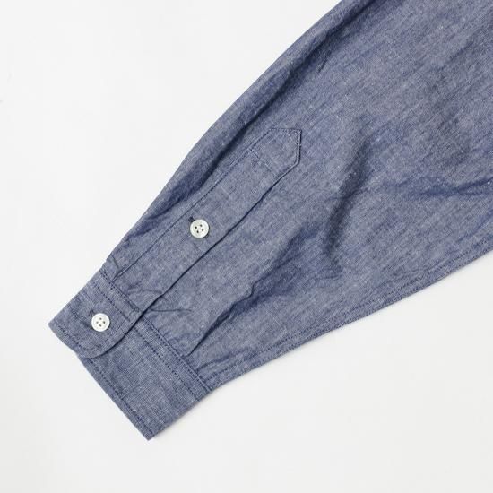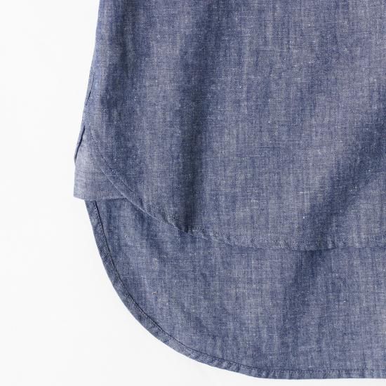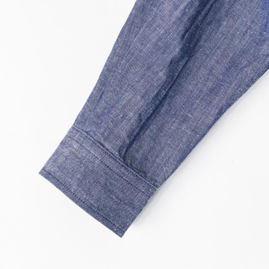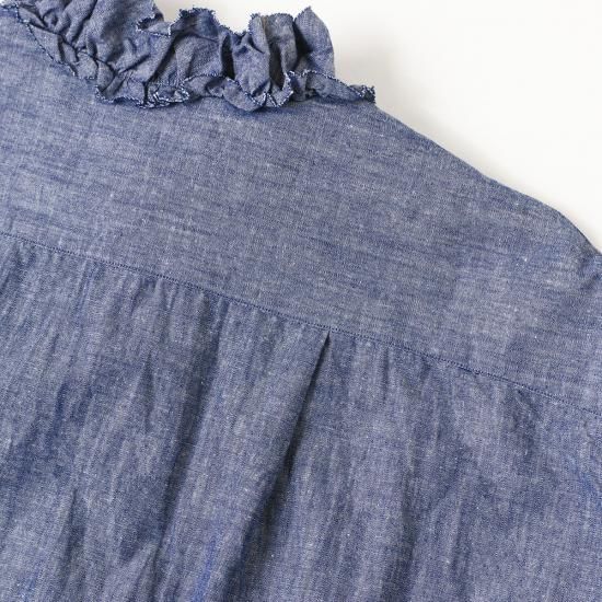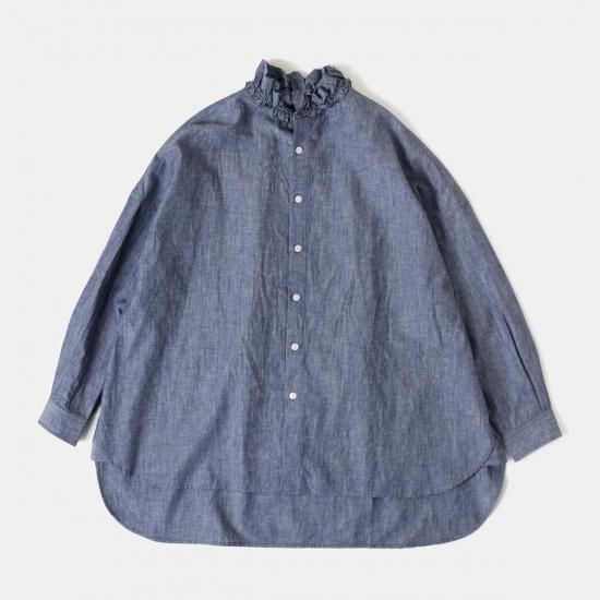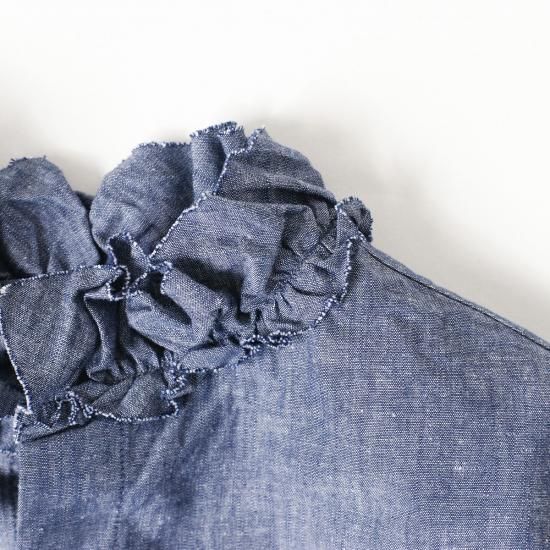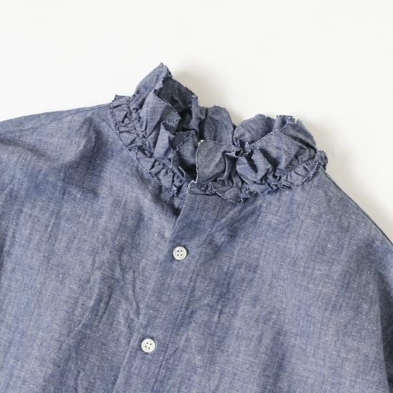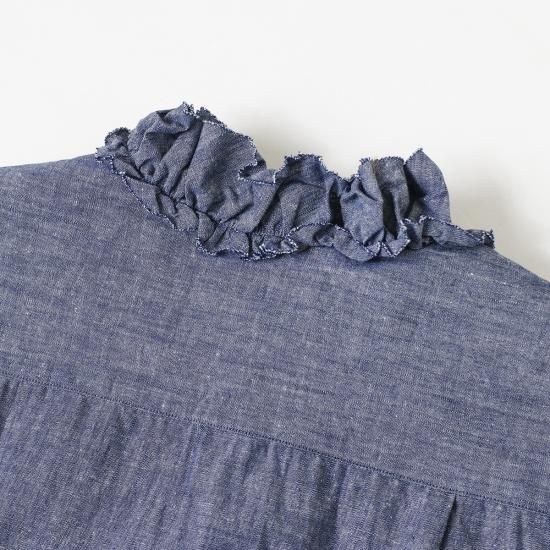 コットンダンガリーで仕立てた「RUFFLE SHIRT」。しなやかなダンガリー素材は着込むほどに風合い豊かに。襟元のフリルがコーディネートのさりげないポイントで、そのままシンプルな着こなし、ボタンを開けて羽織ったり、タックインスタイル、ジャケットやコートのインナーにも。幅広いスタイリングを楽しめる一着です。