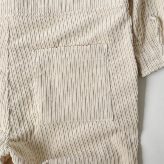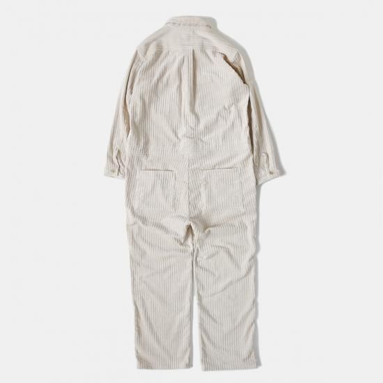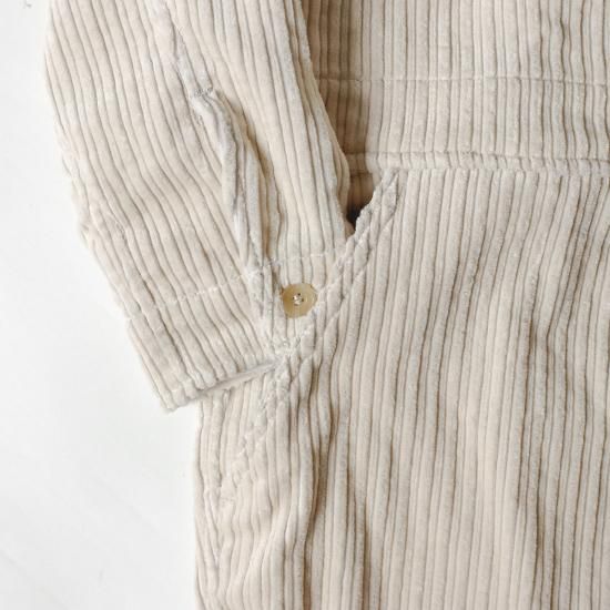 Yarmo定番のボイラースーツ=オールインワン。太畝と細畝が交互に並んだコーデュロイ生地 (通称:親子コール) を採用し、温かみと奥行きのある独特な表情を味わえます。腰回りからレングスにかけてゆとりも持たせながらもダボつきのない絶妙なサイズバランスで、様々なスタイリングを楽しめる一着となっています。