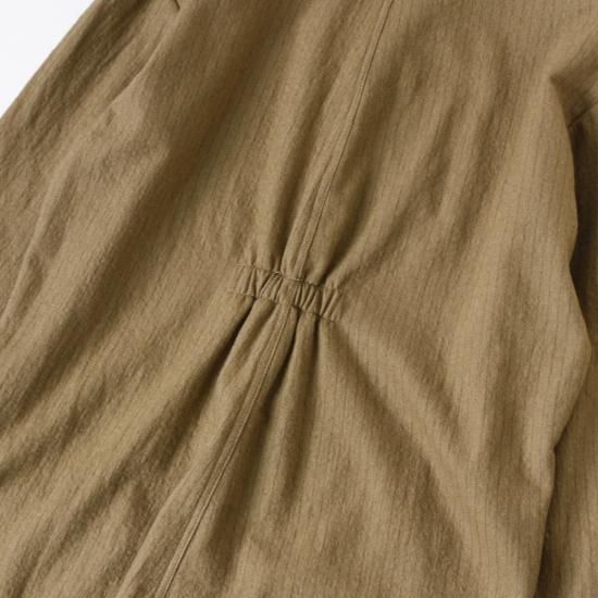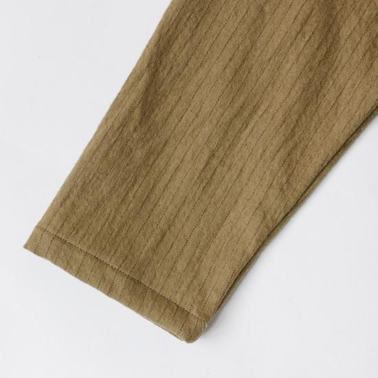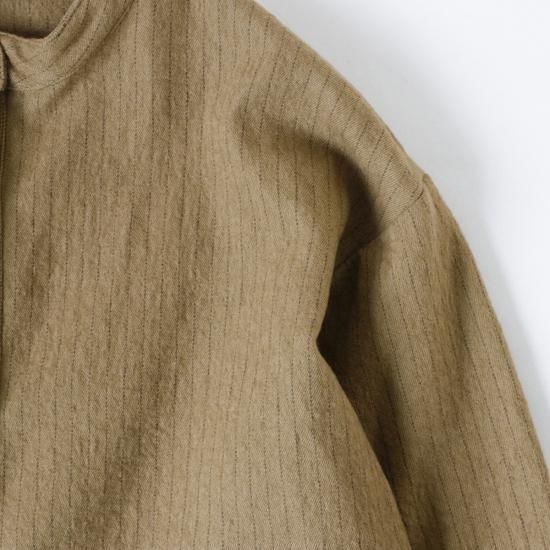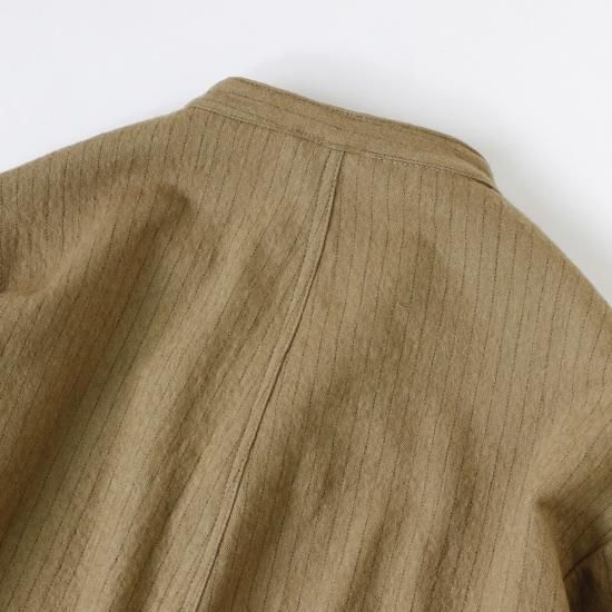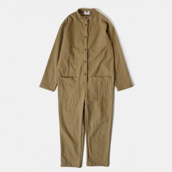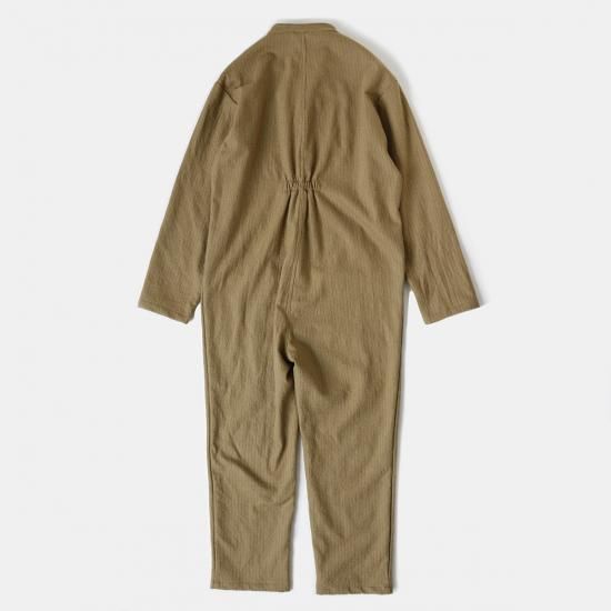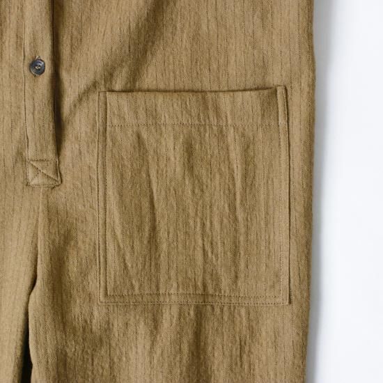 オールインワンのニューモデル「WAREHOUSE SUIT」。ボイラースーツよりも全体的なゆとりを抑え、すっきりとしたサイジングに仕上げています。背面ウエスト部分にはゴムが入っており動きやすさも確保。襟元のバンドカラーや裾のテーパードシルエットもポイントです。生地はストライプのコットンウールを採用。耐久性と保温性を兼ね備えています。レイヤードもしやすく、様々な着こなしを楽しめる一着です。
