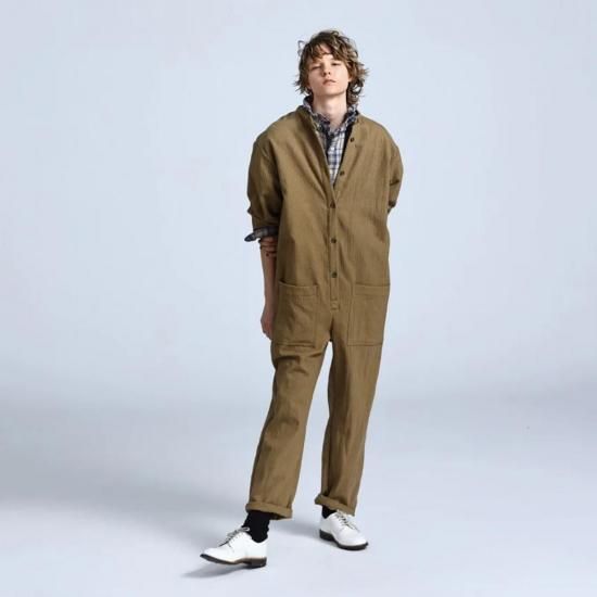 オールインワンのニューモデル「WAREHOUSE SUIT」。ボイラースーツよりも全体的なゆとりを抑え、すっきりとしたサイジングに仕上げています。背面ウエスト部分にはゴムが入っており動きやすさも確保。襟元のバンドカラーや裾のテーパードシルエットもポイントです。生地はストライプのコットンウールを採用。耐久性と保温性を兼ね備えています。レイヤードもしやすく、様々な着こなしを楽しめる一着です。