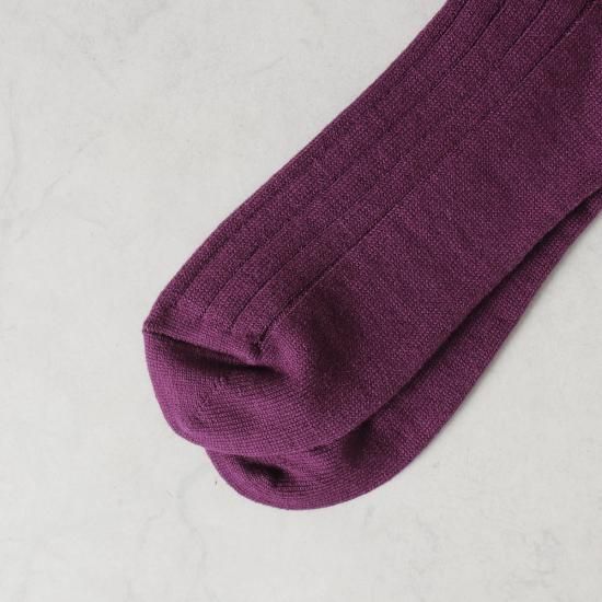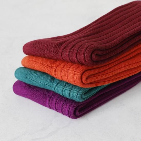 カシミヤとコットンの混紡糸で編み立てた「Cashmere Cotton Ribbed Socks」。滑らかでソフトな肌触りのカシミヤと耐久性の高いコットンでバランス良く仕上げています。厚すぎず薄すぎない程よい肉感、シンプルなリブ編みもポイント。豊富なカラーバリエーションも魅力の一足です。