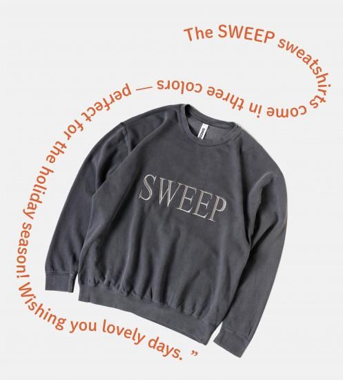 フロントの刺繍ロゴがポイントの「SWEEP Sweatshirts」。ピグメントダイを施したソフトで風合い豊かなボディに、同色の糸で刺繍をあしらったリッチな一枚に仕上がっています。ライトオンスの裏起毛が軽くて暖かな着心地です。カラーはIVORY、PEACH、PEPPERの3色。サイズは男女兼用でM、Lの2サイズ展開。