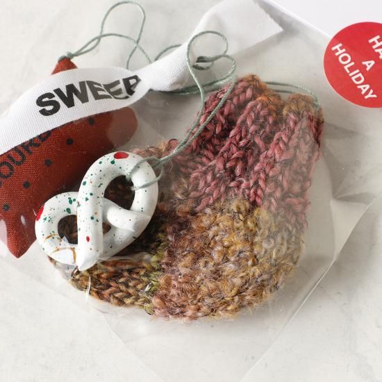 ミニソックス、プレッツェル、ミニピローの3つがセットになった、ホリデーシーズン限定「WOOLY MINI SOCK & FOOD ORNAMENTS」。ミニソックスは様々な毛糸を組み合わせて編み上げた一点もの。プレッツェルは樹脂粘土を一つ一つペイントし仕上げに防水塗料を施しています。ミニピローはイギリスの定番菓子Bourbon Biscuit をイメージ。ツリーやリースの飾り付け、ホリデーギフトにもおすすめです。