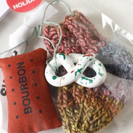 ミニソックス、プレッツェル、ミニピローの3つがセットになった、ホリデーシーズン限定「WOOLY MINI SOCK & FOOD ORNAMENTS」。ミニソックスは様々な毛糸を組み合わせて編み上げた一点もの。プレッツェルは樹脂粘土を一つ一つペイントし仕上げに防水塗料を施しています。ミニピローはイギリスの定番菓子Bourbon Biscuit をイメージ。ツリーやリースの飾り付け、ホリデーギフトにもおすすめです。