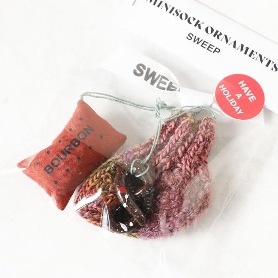 ミニソックス、プレッツェル、ミニピローの3つがセットになった、ホリデーシーズン限定「WOOLY MINI SOCK & FOOD ORNAMENTS」。ミニソックスは様々な毛糸を組み合わせて編み上げた一点もの。プレッツェルは樹脂粘土を一つ一つペイントし仕上げに防水塗料を施しています。ミニピローはイギリスの定番菓子Bourbon Biscuit をイメージ。ツリーやリースの飾り付け、ホリデーギフトにもおすすめです。